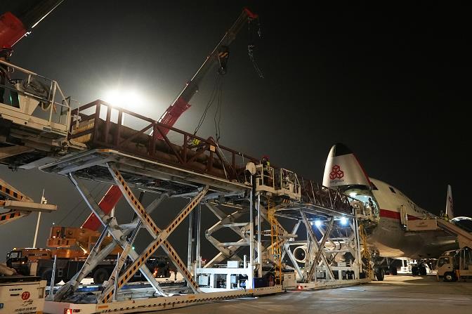 據(jù)測算,26.25米約相當于9層樓高,約占當天承運貨機機身長度的1/2。河南航投盧森堡項目管理部工作人員介紹說,由于飛機地板結(jié)構(gòu)有承重限制,超大貨物需特殊的運輸方案。為確保安全,盧森堡貨航量身定制了組板和安保等專項方案,對貨物入庫、裝機準備、貨物裝機等流程詳細安排,并特別組織了工程師技術(shù)團隊到鄭州現(xiàn)場調(diào)度指揮。據(jù)了解,現(xiàn)場配備了2臺70噸吊車和3臺35噸平臺車保障裝機。航班降落前3小時,盧森堡貨航工作人員就引領(lǐng)相關(guān)車輛和設(shè)備到停機坪就位做好工作準備。
