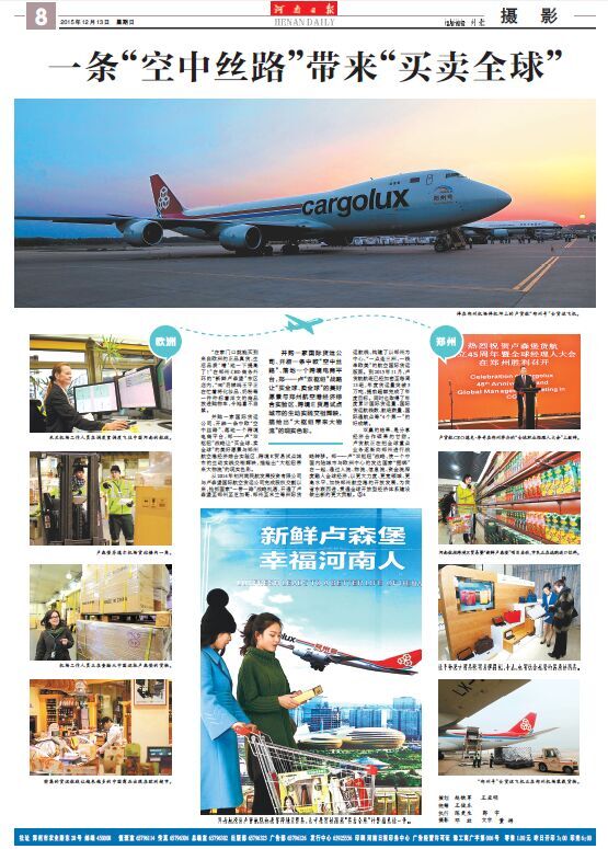 在8次報道中,既有會前的“熱身”宣傳,又有會中的集中點擊,還有會后的回顧追蹤,形成系列,精彩紛呈。13日,《河南日報》以圖文并茂的整版篇幅,對河南航投與盧貨航的合作,尤其是“新鮮盧森堡”雙向跨境E貿易進行了詳細報道。整個報道以新聞攝影為主,既有盧貨航“鄭州號”波音747-8F全貨機,也有鄭-盧航線的專業(yè)操作流程展示,還有河南百姓采購“新鮮盧森堡”商品的真實場景……以鄭盧“雙樞紐”為典型案例,圍繞“一條‘空中絲路’帶來‘買賣全球’”這一主題,生動展現(xiàn)了河南省依靠藍天對外開放的新思路和新成就。