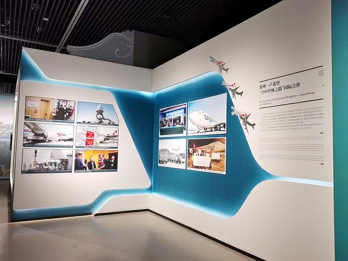 這一主題展板上,精選了10張圖片記錄豫盧共建“空中絲路”的關鍵事件。既有2014年河南航投與盧森堡貨航在鄭州簽署股權合作協(xié)議、“鄭州號”巨無霸貨機首次抵鄭的起始節(jié)點;也有這條絲路承運河南省向盧方捐贈的抗疫物資、鄭盧直飛客航首批旅客抵達的溫暖瞬間;還有盧森堡貨航在鄭州加注可持續(xù)航空燃料、鄭盧航線貨運量突破100萬噸的喜慶時刻,精彩講述豫盧雙方在“一帶一路”框架下相融互促,從硬聯(lián)通、軟聯(lián)通到心聯(lián)通的生動實踐。
